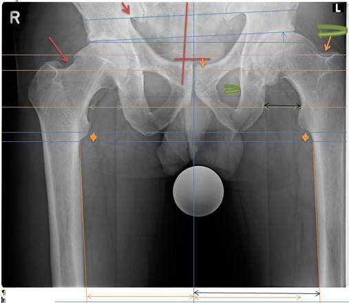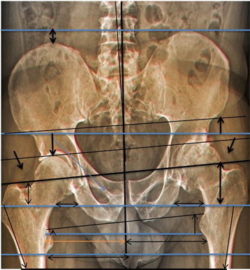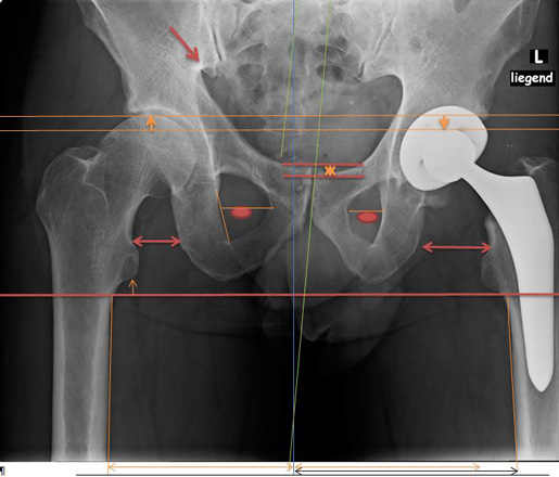 1. Verschiebt sich das Becken zur Seite, oder verdreht es dasselbe, führt dies automatisch zu einer Beckenhöhenabweichung, die dann irrtümlich als Beinlängen-Unterschied bebildert und vermessen wird.