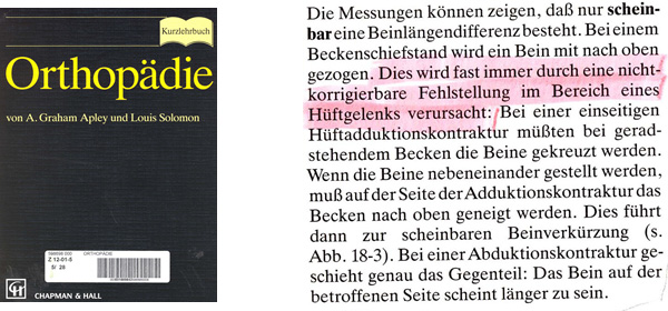 Statt des Beckenausgleiches werden Rückenschmerzen, Hüftbeschwerden und Fehl-Stellungen der Beine und Füsse am Ende einer Fehlbelastungskette behandelt. Die Verspannungslinien führen zu einseitigen Gelenküberbelastungen und werden dann als Arthrose beschrieben und bebildert.