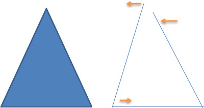 Verschiebt sich die untere Linie des Dreiecks seitlich, verändert es die Schenkelstellungen. Die eine Seite wird steiler, bei der anderen wird der Winkel kleiner. Obwohl die Längen unverändert sind, erfolgt optisch und scheinbar ein Längenunterschied. Nur beim Becken wirkt sich dies über den Schenkelhals als Übersetzung noch stärker aus