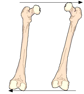 Durch seitliche Hüftverschiebung, hier auf der Abbildung Mitte zu sehen ist, erfolgt eine scheinbare wie auch messbare längen Abweichungen. Grund dafür ist  die seitliche Beckenverschiebung die zu einer Schenkel Winkel Veränderung zum Becken führt und somit den scheinbare längen Unterschied  verursacht.
