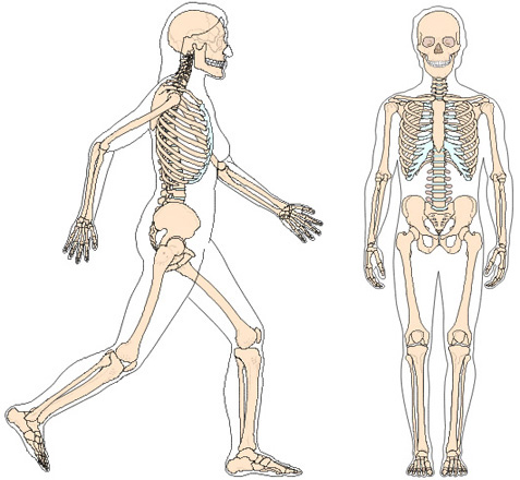 Das Skelett besteht aus einzelnen  Knochen, Gelenken, Wirbelkörpern und wird über Bänder, Sehnen und Muskeln zusammengehalten und bewegt. (ca. 206 Knochen im erwachsenen Alter)