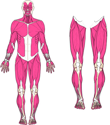 Muskulatur, Sehnen und Bänder sind für die Bewegung und den Zusammenhalt des Skeletts verantwortlich. Die Muskeln benötigen die Knochen als Kraftübersetzung. (ein gesunder Mensch ca. 656 Muskeln)